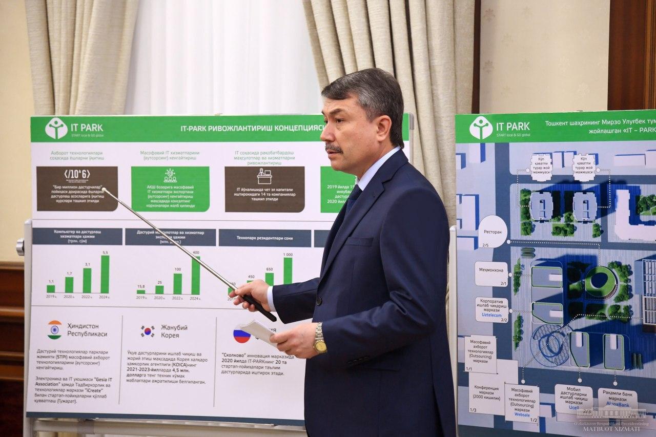 В целях дальнейшего развития и повышения экспортного потенциала данной сферы при сотрудничестве Министерства по развитию информационных технологий и коммуникаций Республики Узбекистан и Общества парков программных технологий при Министерстве электроники и информационных технологий Республики Индия в нашей стране создается IT-парк. Кабинет Министров принял соответствующее постановление 10 января 2019 года и в Мирзо-Улугбекском районе Ташкента начато строительство Технологического парка программных продуктов и информационных технологий.